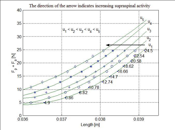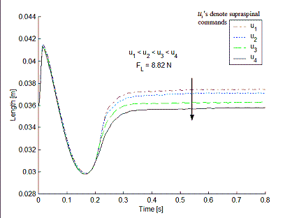 Results: Middle Figure shows the transient response of the system under a step load for various amounts of descending control. Bottom Figure shows steady state force-displacement curves as a function of amount of descending control. The numbers along the curve show the amount of loading for that datapoint.