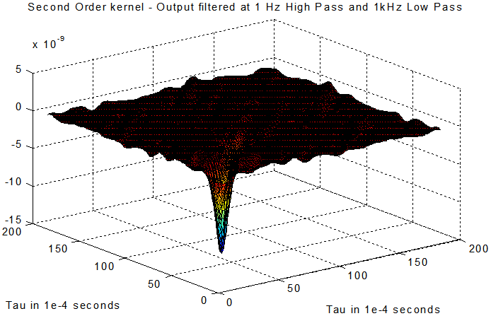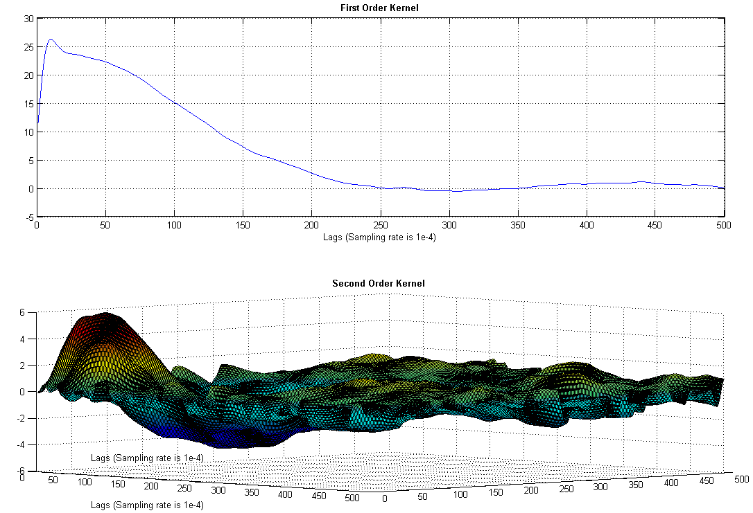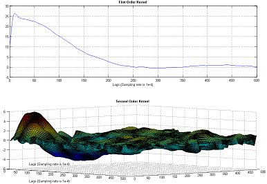 -- Compute the Volterra or Wiener kernels (See Figures for computed first and second Wiener kernels) ; to reduce computation, discretize each kernel using Orthogonal Basis Functions (OBFs). Optimize number of OBFs for each order of the nonlinearity.