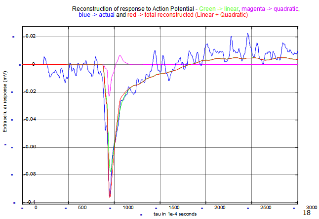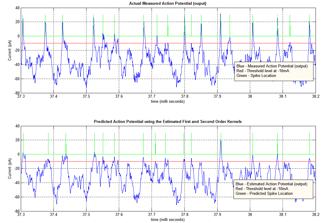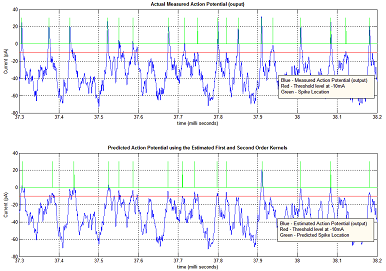 -- Stimulate system under current clamp to generate an action potential, record AP and microlectrode signal, run the AP through the kernels and compare with experimental output to validate model. (See Figure: Bottom)