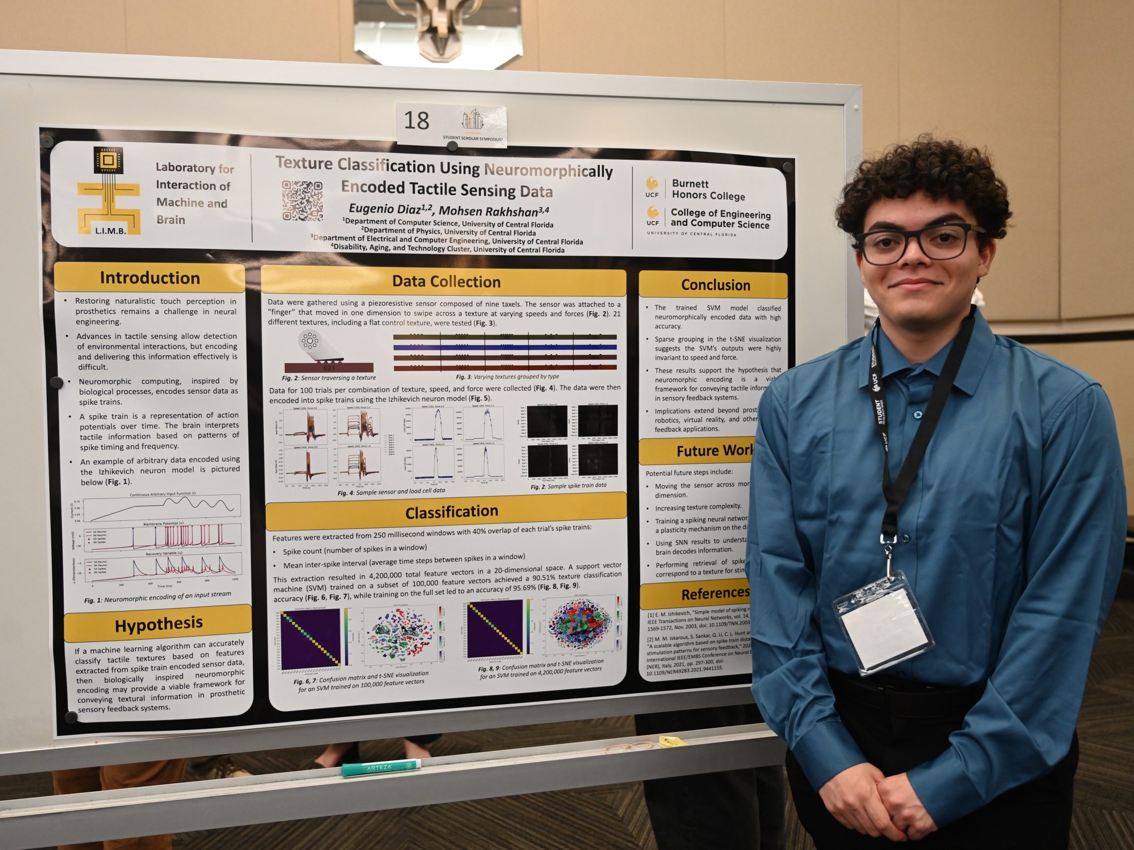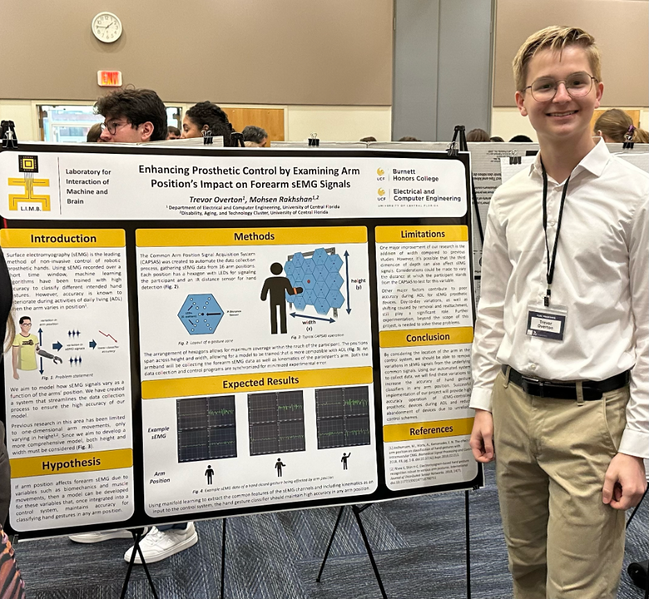 “Attending the Florida Undergraduate Research Conference was a great first conference for me. It was a challenging yet enriching experience explaining our research to an interdisciplinary audience. Many people were excited to learn how our lab is trying to enhance prosthesis control, and I even received a comment from one person saying the poster was the best he had seen that day. The conference had a large turnout from fellow UCF Knights, so there was a lot of support from my peers. Also, I enjoyed discovering what other undergrads from around Florida were researching. Overall, it was a pleasant experience, and I look forward to presenting my research at more conferences in the future.”