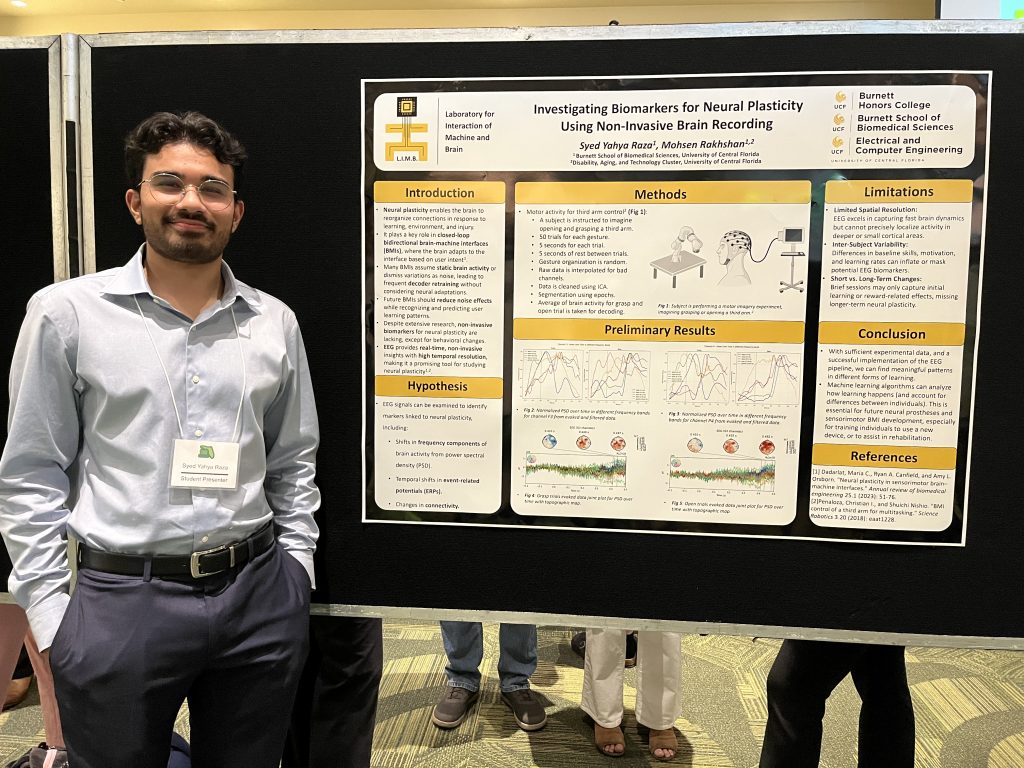 “The Florida Undergraduate Research Conference provided me with an excellent opportunity to present my research to a diverse academic audience, which proved both difficult and rewarding. Audiences were fascinated by brain-machine interfaces(BMIs) and neural plasticity garnered significant interest, with a couple attendees also discussing their own computational neuroscience projects with me. The strong presence of UCF Knights provided substantial peer support. The experience was extremely positive, and I’m eager to participate in future conference presentations.”