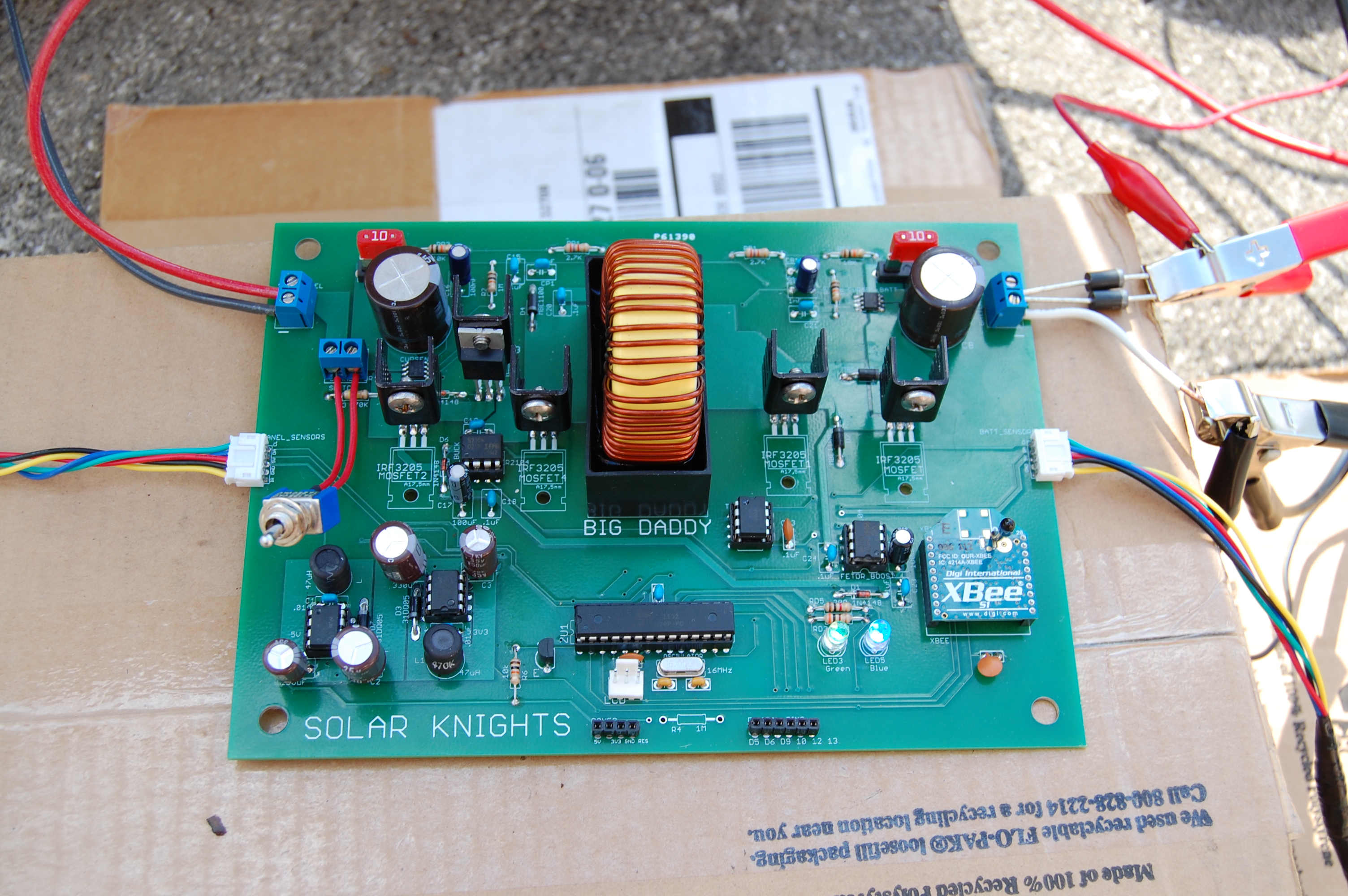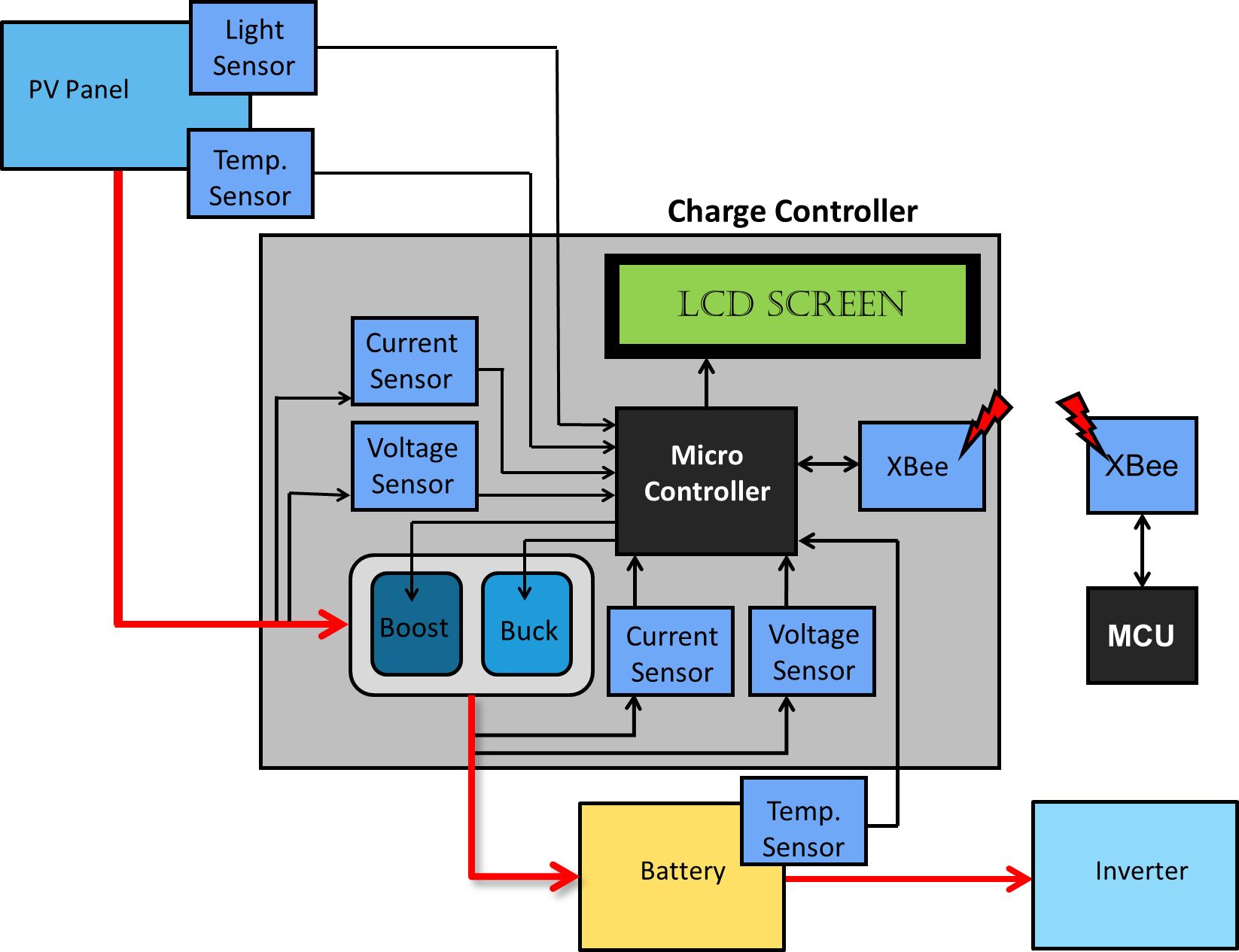 To demonstrate an off-the-grid charge controller, there are four major components needed. First, solar panels are used as the energy source. This power is fed to the charge controller which is output into a battery which allows for energy storage. On the output of the battery is an inverter which provides outlets for the user to access the stored energy. The solar panel, battery, and inverter were bought as off-the-shelf parts, while the MPPT charge controller was designed and built by Solar Knights. In addition to providing efficient power storage, the charge controller features a LCD screen for live data capture, and a radio frequency (RF) module for wireless data logging. The charge controller consists of a DC-to-DC Buck-Boost converter, 5V and 3.3V switching regulators, 10A fuses, reverse protection diodes, microcontroller, LCD, wireless transceiver, temperature sensors, voltage sensors, current sensors, and an irradiance sensor.