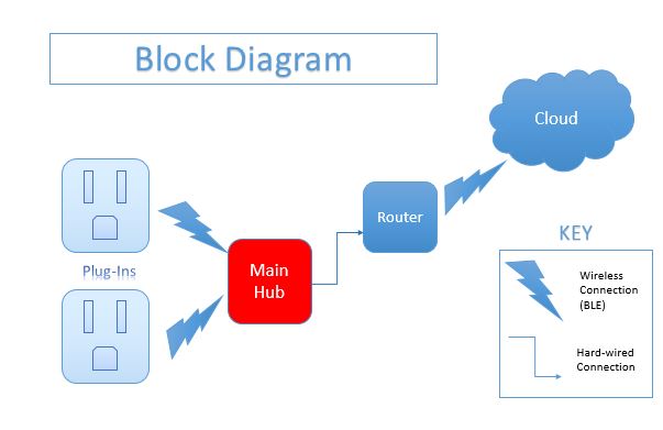 Our project has three main parts, the wall devices which measure energy output of individual devices and send that information wirelessly over Bluetooth to the main microcontroller which sends the information to the internet where the user can access it through logging in.