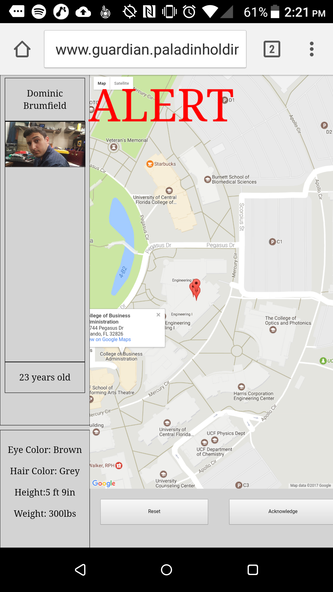This app will be visible to local authorities, and upon startup will show a screen with no information on it. Once either Device 1 or the phone application sends out the activation signal to Device 2, an alert will be picked up, and based on the email users used during registration, will pull up all the necessary information associated with the email from the database and display it on the left side of the app. As well, GPS coordinates will be received from the phone's location services, and will display it on the right side of the app. The coordinates will update themselves every five seconds, so authorities can track the user's trail. The authorities can acknowledge the user's alert, and will still update the current location until either the phone's location services is turned off, or the authorities reset the Workstation.